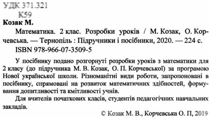 НУШ Математика 2 клас Розробки уроків до підруч. М. Козак О. Корчевської Підручники і посібники. У посібнику подано розгорнуті розробки уроків з математики для 2 класу (до підручника М. В. Козак, О. П. Корчевської) за програмою Нової української школи.