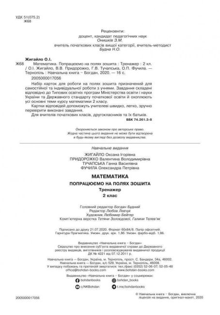 Тренажер Математика Попрацюємо на полях зошита 2 клас НУШ Авт: Жигайло О.І. Придорожко В.В. Тучавська Г.В. Фучила О.П. Вид-во: Богдан 97408