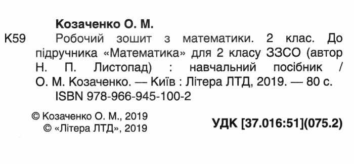 Математика 2 клас Робочий зошит до підручника Н. Листопад НУШ Авт: Козаченко О. Вид: Літера