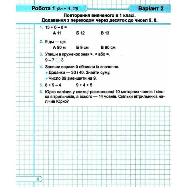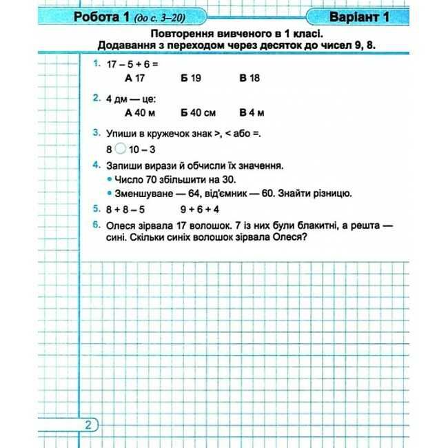 Математика Діагностичні роботи 2 клас До підручника Листопад Н. НУШ. Пропонований зошит відповідає вимогам Державного стандарту початкової освіти, Типовій освітній програмі з математики за редакцією О. Я. Савченко та підручнику Листопад Н. П. Математика підручник для 2 кл. закладів загальної середньої освіти Київ УОВЦ Оріон 2019.