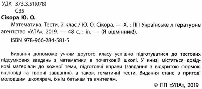Видання Математика. Тести. 2 клас Я відмінник допоможе учням другого класу успішно підготуватися до тестових підсумкових завдань з математики в початковій школі. У книзі містяться довідкові матеріали до кожної теми, підготовчі вправи (завдання з відкритою формою відповіді та творчі завдання), а також тематичні тести.