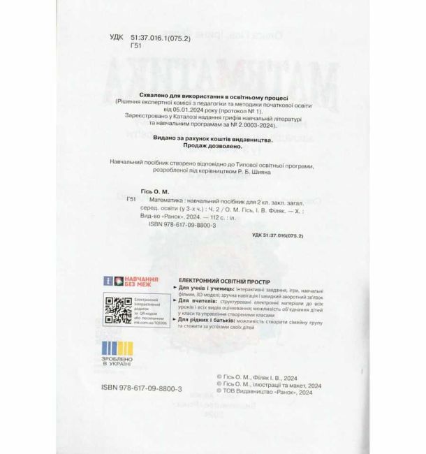 Навчальний посібник «Математика» для 2 класу ЗЗСО створено відповідно до Типової освітньої програми, розробленої під керівництвом Р. Б. Шияна. Це сучасне навчальне видання, яке органічно поєднує функції підручника і робочого зошита. Він щедро проілюстрований, наповнений веселими ігровими сюжетами, що підвищує мотивацію учнів/учениць до навчання.