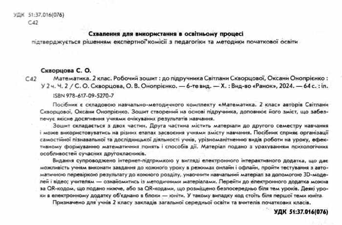 Робочий зошит до підручника Світлани Скворцової, Оксани Онопрієнко 2 частина Математика 2 клас НУШ. Посібник є складовою навчально-методичного комплекту Математика 2 клас авторів Світлани Скворцової, Оксани Онопрієнко. Зошит створений на основі підручника, доповнює його зміст, що забезпечує якісне досягнення учнями очікуваних результатів навчання. Зошит складається з двох частин і може використовуватись на різних етапах засвоєння учнями змісту навчання.