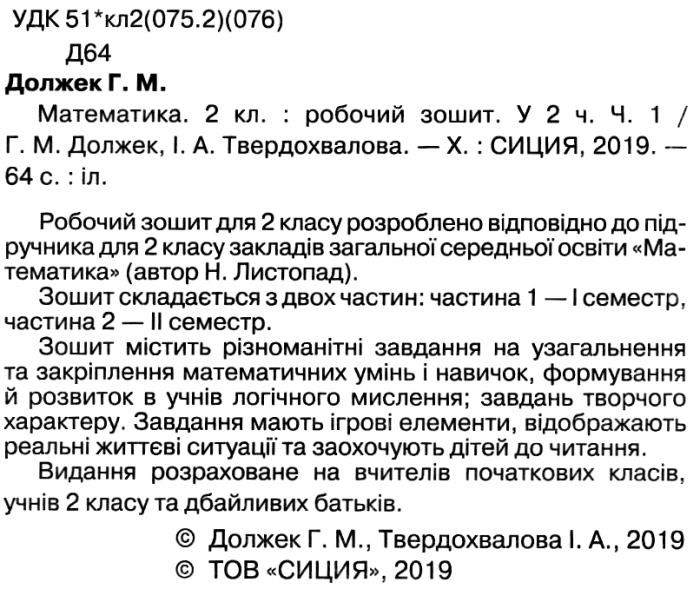 Робочий зошит Математика 2 клас 1 частина До підручника Листопад Н. НУШ Авт: Должек Г. Вид: Сиция