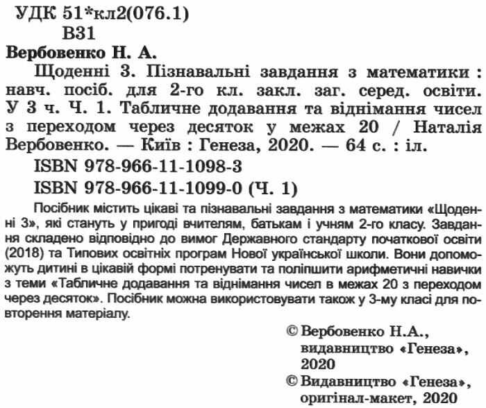 Щоденні 3 Навчальний посібник з математики 2 клас Частина 1 НУШ Вербовенко Н. Генеза. Посібник містить цікаві та пізнавальні завдання з математики "Щоденні 3", які стануть у нагоді вчителям, батькам і учням 2-го класу. Завдання складено відповідно до вимог Державного стандарту початкової освіти та Типових освітніх програм Нової Української Школи. Вони допоможуть дитині в цікавій формі потренувати та поліпшити арифметичні навички з теми "Табличне додавання та віднімання чисел у межах 20 з переходом через десяток".