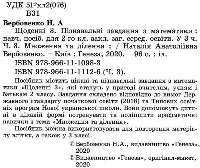 Щоденні 3 Навчальний посібник з математики 2 клас Частина 3 НУШ Вербовенко Н. Генеза