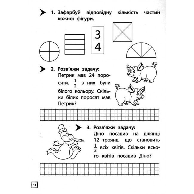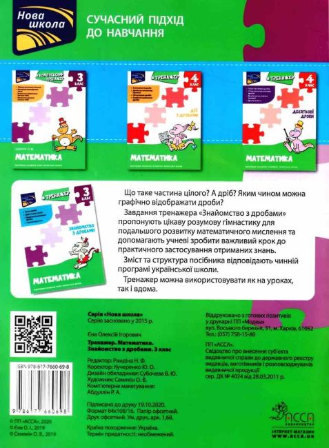 Тренажер Математика Знайомство з дробами 3 клас АССА. Завдання тренажера допоможуть дитині зробити важливий крок до практичного застосування отриманих знань та стануть цікавою розумовою гімнастикою для подальшого розвитку математичного мислення.