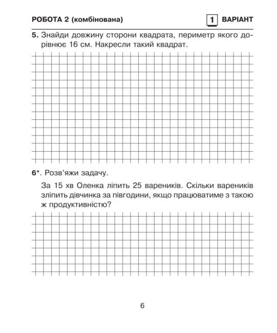 Роботи №1, 2, 3, 5, 6 комбіновані. Вони складаються із 8 завдань на обчислення, розв’язування задачі, рівняння або нерівності, завдань з іменованими числами, геометричного матеріалу та творчого завдання.