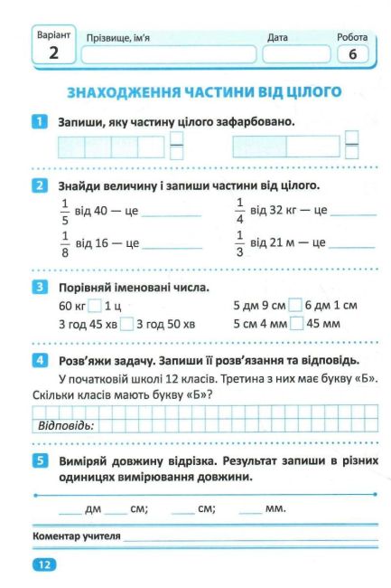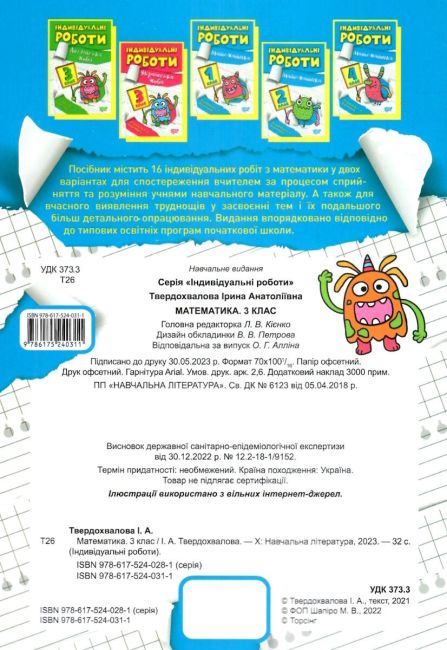 Посібник містить 16 індивідуальних робіт з математики у двох рівноцінних варіантах для спостереження вчителем за процесом сприйняття та розуміння учнями навчального матеріалу. А також для вчасного виявлення труднощів у засвоєнні певних тем і їх подальшого більш детального опрацювання. Видання впорядковано відповідно до типових освітніх програм початкової школи.