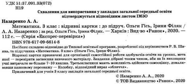 НУШ Математика 3 клас Відривні картки до підручника О. Гісь Експрес-перевірка Ранок. Посібник складено відповідно до Типової освітньої програми, розробленої під керівництвом р. Б. Шияна, та підручника «Математика. 3 клас» (ольги Гісь, Ірини Філяк).