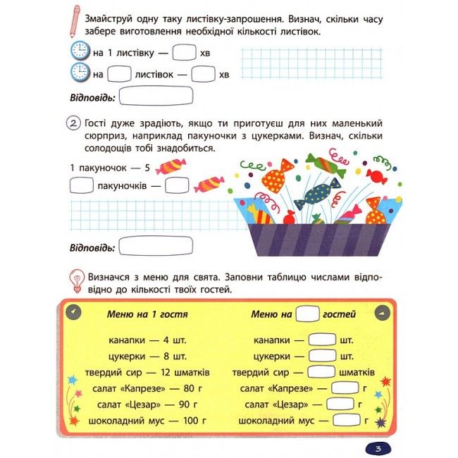 Завдання підібрано відповідно до віку дитини і шкільної програми, але в новій сучасній формі. Наприклад, школяр плануватиме бюджет, влаштовуватиме вечірки та обиратиме подарунок вивчаючи математику.