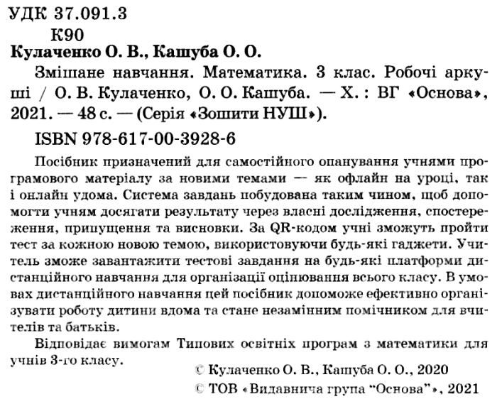 Змішане навчання Математика 3 клас Робочі аркуші НУШ Кулаченко О. Основа. Робочий зошит це дієва допомога другокласникам у набутті компетентнісних математичних знань, умінь та навичок в умовах дистанційного навчання чи навчання офлайн. Зміст зошита відповідає вимогам Типових освітніх програм із математики.