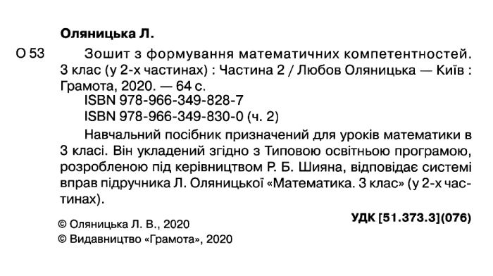 Зошит з формування математичних компетентностей Математика 3 клас 2 Частина НУШ Оляницька Л. Грамота. Навчальний посібник призначений для уроків математики в 3 класі.