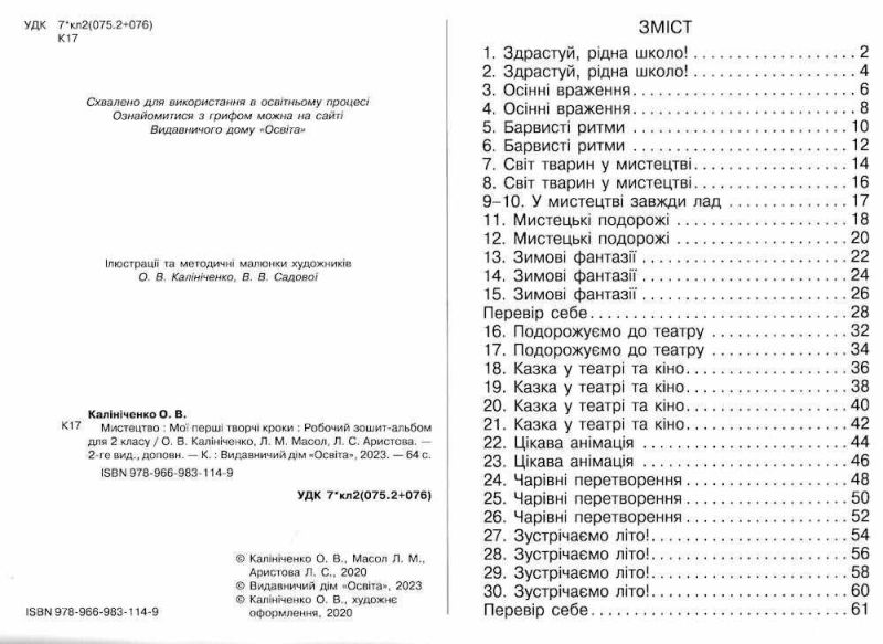 Робочий зошит-альбом Мистецтво Мої перші творчі кроки 2 клас НУШ видання 2-ге, доопрац. Калініченко О. Масол Л. Освіта. Містить запитання для обговорення, цікаві малюнки.