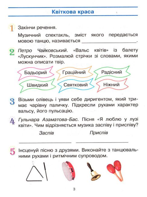 Робота із зошитом навчить третьокласників сприймати музичні твори, відчувати характер і настрій музики, створювати та виконувати прості ритмічні супроводи; розвине художній смак та любов до українського музичного мистецтва.