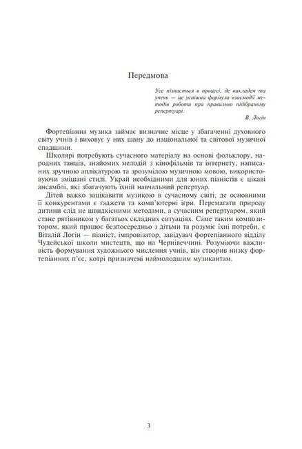 Пропонований збірник фортепіанних творів Віталія Логіна призначений для учнів 1-3 класів музичних та мистецьких шкіл. Матеріал посібника допоможе піаністам-початківцям оволодіти навичками гри на фортепіано, краще зрозуміти і відтворити образ музичних творів.