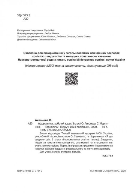 Робочий зошит Інформатика 3 клас НУШ За програмою О. Савченко Авт: Антонова О. Мартинюк С. Вид-во: Підручники і посібники 38249