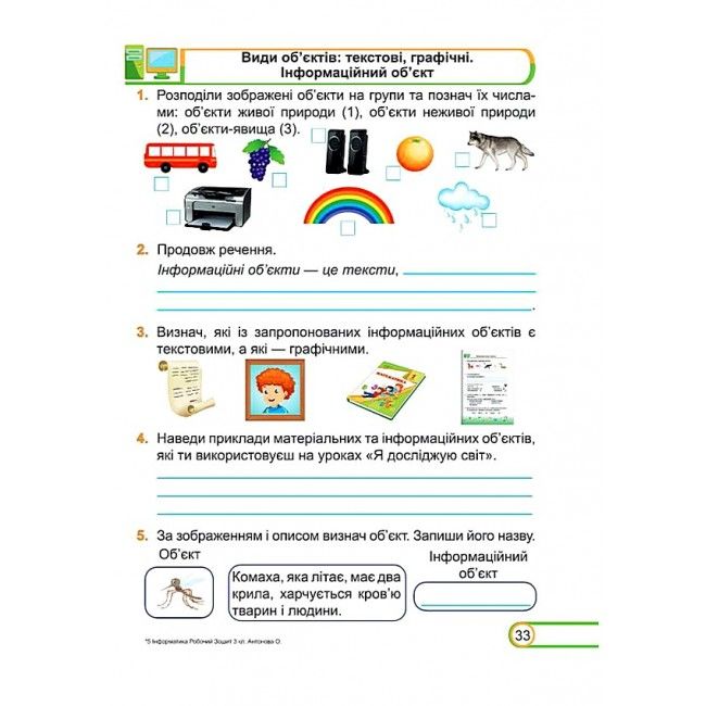 Інформатика Робочий зошит 3 клас За програмою О. Савченко НУШ Антонова О. Підручники і посібники. Зошит відповідає Типовій навчальній програмі МОН України, розробленої під керівництвом О. Я. Савченко, та підручникам Я досліджую світ 3 клас (інформатична освітня галузь).