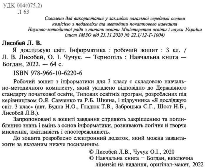 Робочий зошит Я досліджую світ Інформатика 3 клас НУШ До підручника Будна Н. та ін. Авт: Лисобей Л.В. Чучук О.І. Вид-во: Богдан 62298