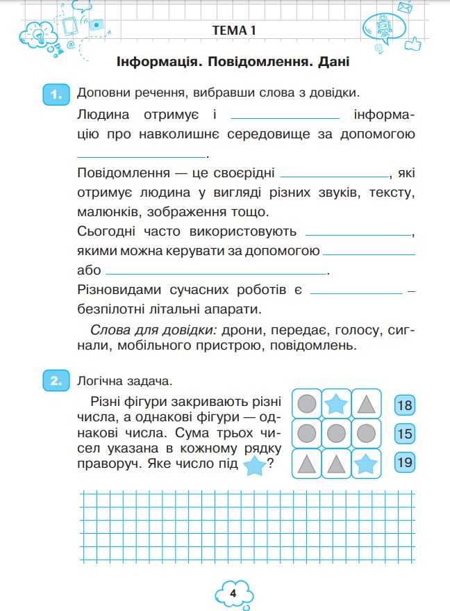 Запропоновані завдання сприятимуть закріпленню та поглибленню знань і вмінь учнів з інформатики, розвиватимуть логічне й творче мислення, спостережливість, увагу і кмітливість. Для учнів та учениць 4-го класу.