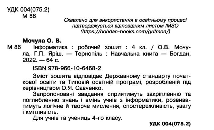 Робочий зошит Інформатика 4 клас НУШ Авт: Мочула О.В. Яріш Г.П. Вид-во: Богдан 63670