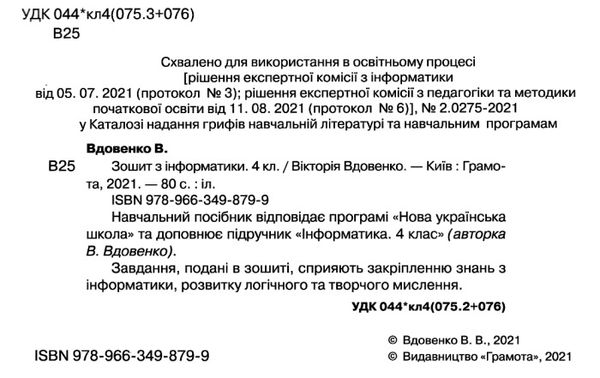 Робочий зошит Інформатика 4 клас НУШ Авт: Вдовенко В. Вид-во: Грамота