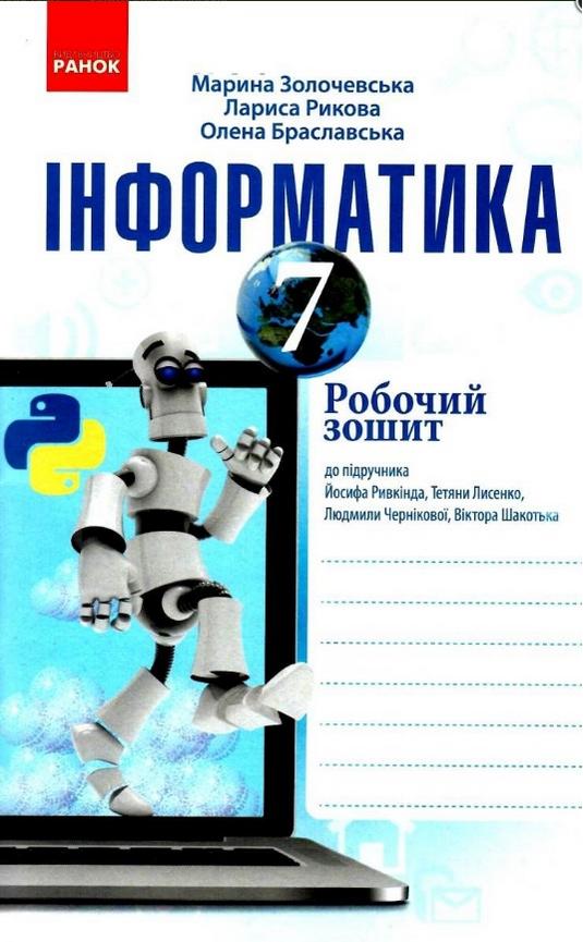 Інформатика 7 клас Робочий зошит до підручника Й. Ривкінда 2020 Золочевська М. Ранок. Посібник складено відповідно до чинної навчальної програми з інформатики для 5-9 класів загальноосвітніх навчальних закладів та з урахуванням концепції підручника «Інформатика» для 7 класу авторського колективу у складі: Йосиф Ривкінд, Тетяна Лисенко, Людмила Чернікова, Віктор Шакотько.