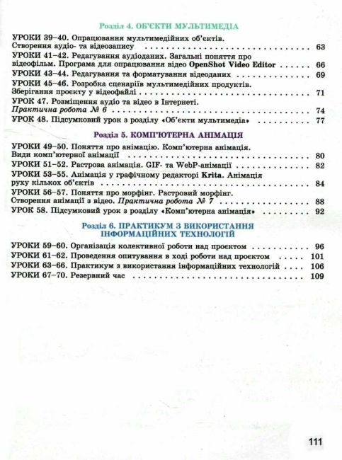На уроках інформатики у 7-му класі ви дізнаєтеся, що таке електронна пошта та хмарні сервіси, які вони є і як їх можна використовувати для організації спільної роботи. Навчитеся створювати проєкти однією з сучасних мов програмування – Python. Продовжите створювати та опрацьовувати комп’ютерні презентації. Будете розробляти аудіо- та відеопроєкти, а також анімовані графічні зображення. Набуті компетентності учні та учениці зможуть застосовувати під час виконання навчальних проєктів на уроках інформатики та інших предметів.