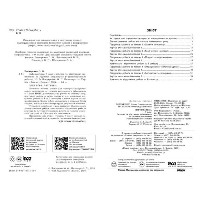 Усі роботи розроблено у двох варіантах. Другі варіанти діагностувальної роботи, комплексних підсумкових робіт за семестри та поточні інтерактивні роботи за групами результатів доступні за QR-кодом або посиланням.