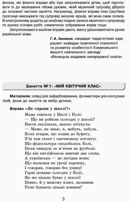 Кожна?частина?альбому?складається?з?двох?блоків:?перший?призначений?учневі,?другій?учителеві.?У?першому?блоці?містяться?частково?декоровані?фони?для?малювання?обома?руками.?У?другому?методичні?поради?вчителям. + Методичні рекомендації 16 сторінок.