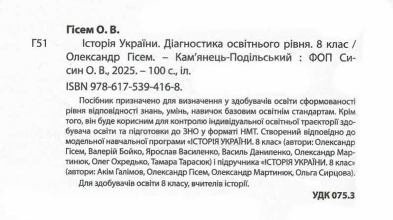 Діагностика освітнього рівня Історія України 8 клас НУШ Авт: Гісем.О.В. Вид-во: Абетка 112243