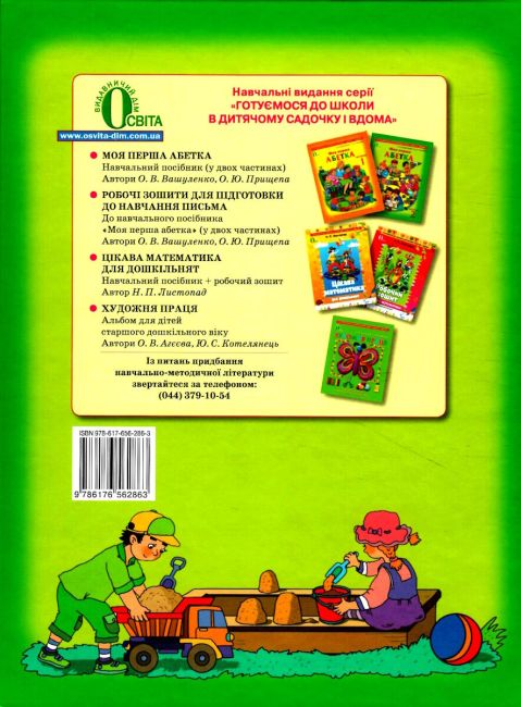 Моя перша абетка частина 2 для дітей 5-6 років Вашуленко О. Освіта. Навчальний посібник «Моя перша абетка» (у 2-х частинах) призначений для занять із дітьми старшого дошкільного віку, які готуються до школи. Він може бути використаний на заняттях із навчання грамоти дітей у дошкільному закладі та під час індивідуальної роботи з дитиною вдома.