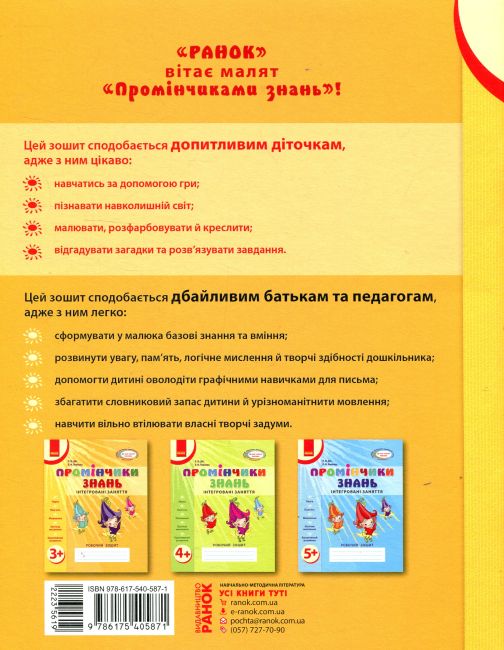 Сучасна дошкільна освіта Промінчики знань Робочий зошит Інтегровані заняття До всіх чинних програм 3 Ранок. Зошит призначений для роботи під час проведення інтегрованих занять упродовж навчального року. Кожний разворот ? окрема тема, вивчення якої розраховано на тиждень.