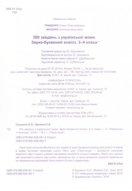 Практикум 300 завдань з української мови Звуко-буквений аналіз 3-4 класи Авт: Грищенко О. Вид: Торсінг