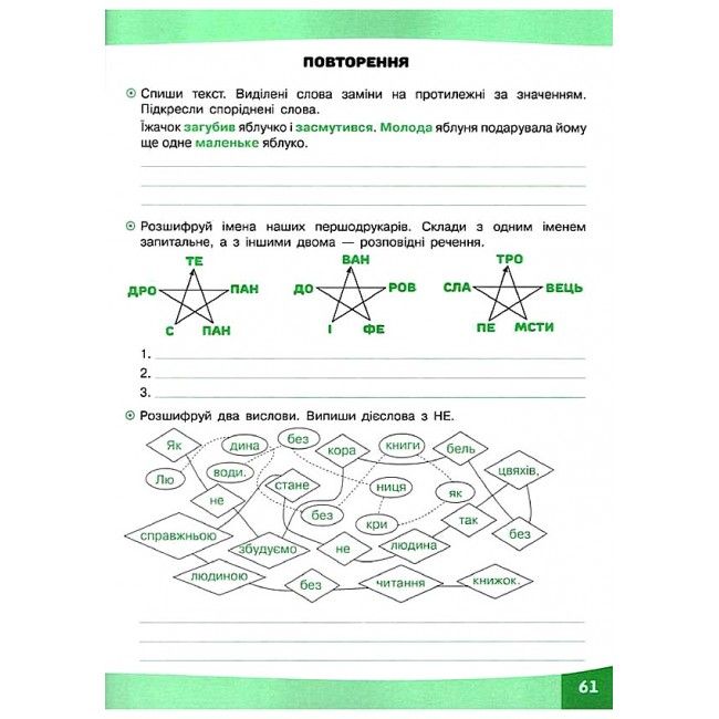 У зошиті застосований ігровий підхід до навчання: школярик буде одночасно відпрацьовувати теми зі шкільної програми та розмальовувати, розгадувати кросворди, загадки і шифрувальники.