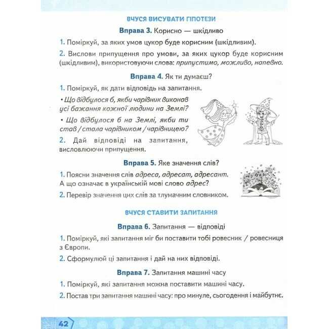 Друга частина посібника містить вправи на розвиток критичного, логічного та асоціативного мислення, вчить ставити запитання, класифікувати поняття, висувати гіпотези та оцінювати рішення, що повністю узгоджується з концепцією НУШ і компетентнісним підходом до навчання.