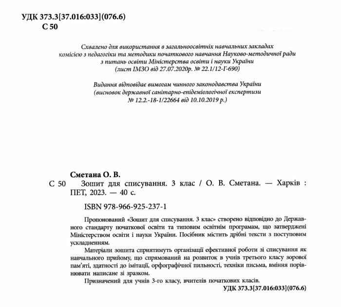 Зошит для списування 3 клас НУШ Сметана О. ПЕТ. Пропонований зошит створено відповідно до Державного стандарту початкової освіти та типовим освітнім програмам, що затверджені Міністерством освіти і науки України.