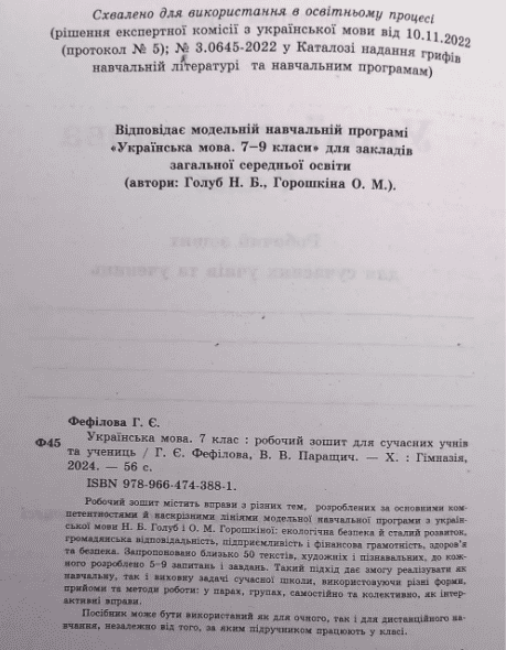 Робочий зошит для сучасних учнів та учениць Українська мова 7 клас НУШ Авт: Г.Є.Фефілова В.В.Паращич Вид-во: Гімназія 102107