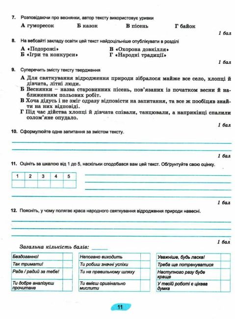 \nКрім оцінювання роботи за 12-бальною шкалою, учитель / учителька може висловити загальне враження від діяльності учнів / учениць. Для цього в кінці кожної роботи запропоновано словесні характеристики, біля яких учитель / учителька за бажанням поставить одну або кілька позначок.