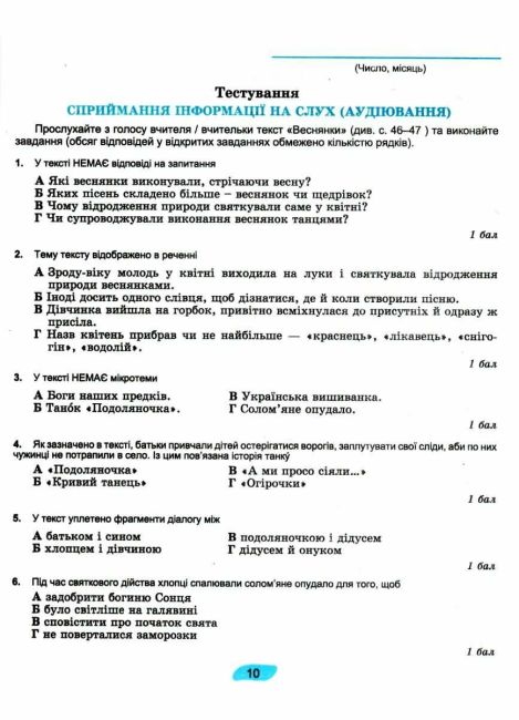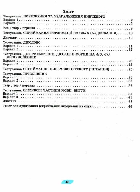 Зошит для виконання низки робіт, за допомогою яких можна оцінити навчальні досягнення з української мови. Зокрема, п’яти робіт для тематичного оцінювання та двох робіт для оцінювання вміння сприймати письмові й усні тексти. Також передбачено окремі сторінки для диктантів, письмових есе (творів чи переказів).