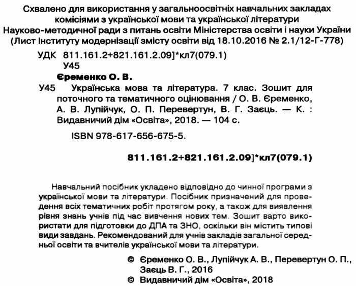 Зошит для поточного тематичного оцінювання Українська мова та література 7 клас Нова програма Авт: О. Єременко Вид: Освіта