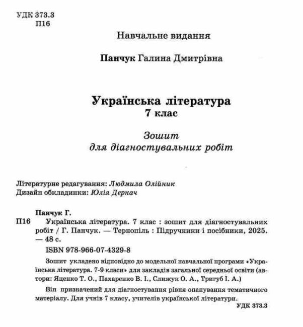 Зошит для діагностувальних робіт Українська література 7 клас НУШ Авт: Г. Панчук Вид-во: Підручники і посібни 106157