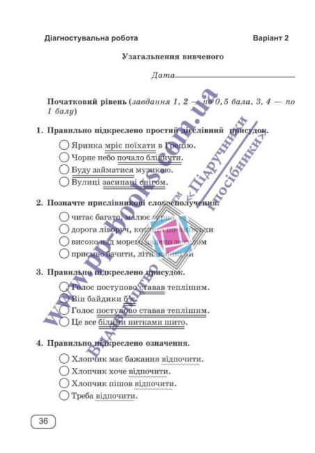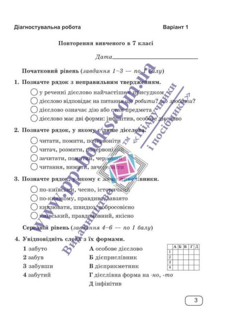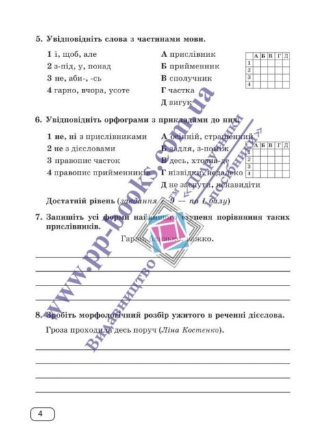 Посібник укладено з метою формування та перевірки мовних і мовленнєвих компетентностей учнів 8 класу. Завдання спрямовані на розвиток уміння правильно й виразно висловлювати думки, аналізувати мовні явища, застосовувати знання з орфографії, пунктуації та стилістики у практичному мовленні. Така система роботи допомагає школярам удосконалювати комунікативні навички й відчувати красу українського слова.