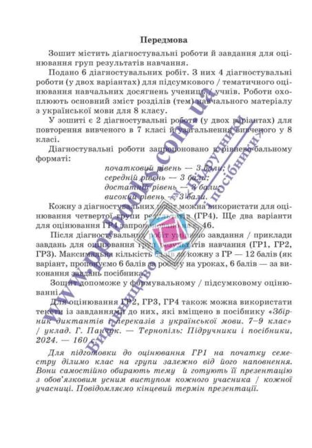 Зошит призначений для учнів 8 класу та вчителів української мови, які працюють відповідно до сучасних освітніх стандартів. Його можна використовувати під час уроків, для поточного чи тематичного оцінювання, а також для самостійної підготовки школярів. Посібник стане ефективним інструментом у навчальному процесі, допоможе розвивати інтерес до української мови та підвищити якість мовної освіти.