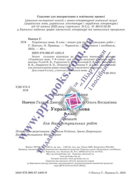 Зошит призначений для учнів 8 класу та вчителів української мови, які працюють у межах концепції Нової української школи. Його можна використовувати під час уроків, для поточного чи тематичного оцінювання, а також для індивідуальної підготовки. Посібник стане ефективним інструментом у роботі педагога, допоможе організувати зворотний зв’язок з учнями та підвищити результативність навчального процесу.