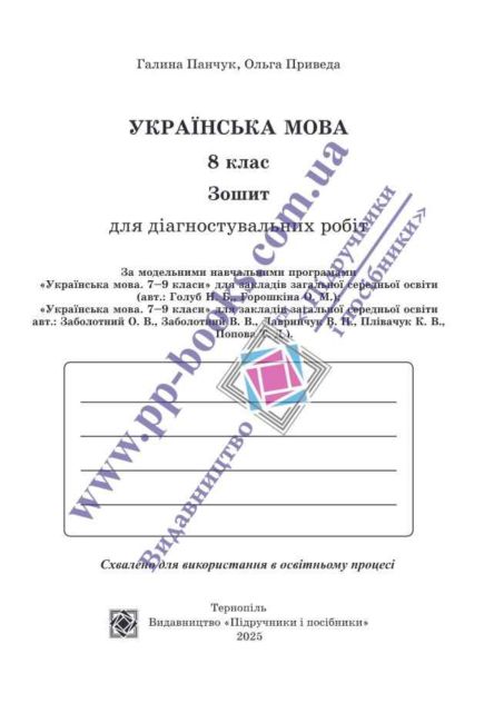 Зошит для діагностувальних робіт Українська мова 8 клас НУШ За програмами Н. Голуб, О. Горошкіної; О. Заболотного та ін. Авт: Галина Панчук Ольга Приведа Вид-во: Пiдручники i посiбники 109834