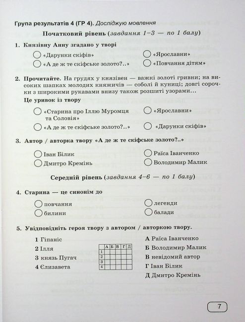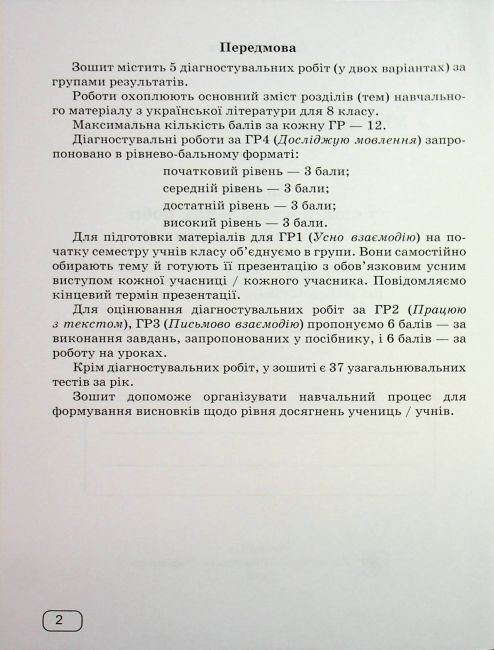 Матеріали зошита укладено за тематичним принципом і подано у зручній структурі, що забезпечує системність і поступовість оцінювання. Завдання різного рівня складності дають змогу проводити поточне, тематичне та підсумкове оцінювання, а також організовувати індивідуальну чи групову роботу. Такий підхід допомагає вчителю ефективно відстежувати навчальні досягнення школярів і формувати в них комплексне розуміння художнього тексту.