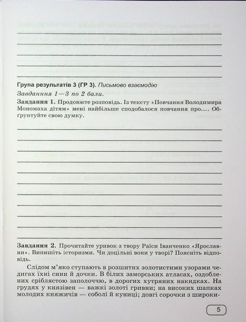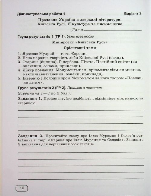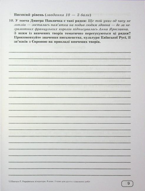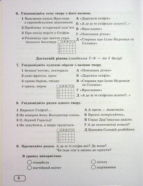 Посібник створено з метою діагностування рівня опанування тематичного матеріалу з української літератури в учнів 8 класу. Завдання зошита допомагають визначити, наскільки учні розуміють зміст художніх творів, уміють аналізувати художні образи, виявляти авторську позицію та формулювати власне ставлення до прочитаного. Така робота сприяє не лише перевірці знань, а й розвитку емоційно-ціннісного ставлення до літератури.