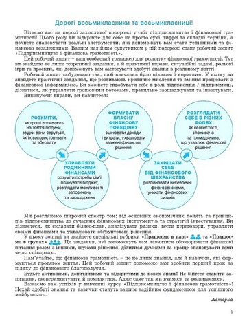 \n Призначений для учнів 8 класів закладів загальної середньої освіти та вчителів підприємництва і фінансової грамотності.