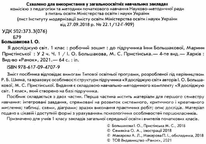 Робочий зошит Я досліджую світ 1 клас Частина 1 До підручника І. Большакової М. Пристінської НУШ Авт: Большакова І. Вид: Ранок